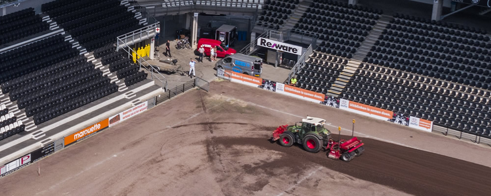 Wij zijn in heel Nederland actief met het lasergestuurd egaliseren van sportvelden. Bovenstaande foto's zijn genomen bij het Polmanstadion in Almelo.